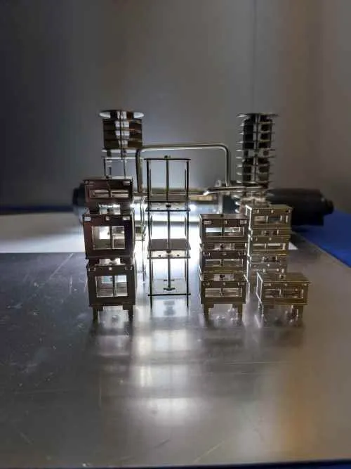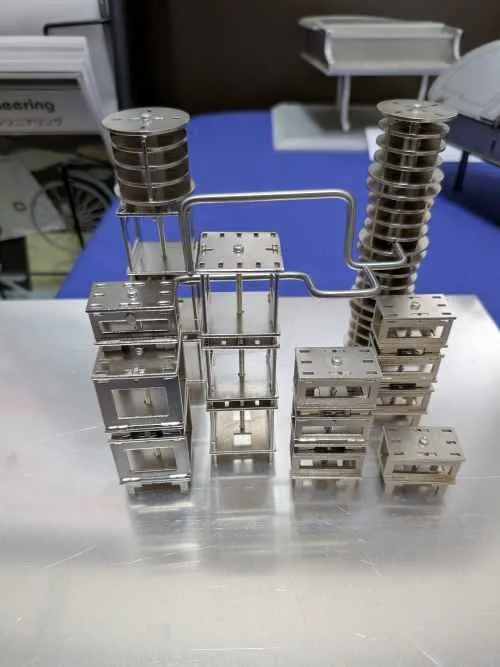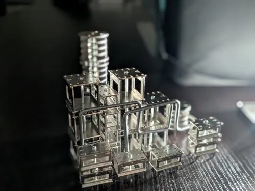 Sキューブ・Lキューブ・円柱の3種類に加えて、工業地帯を縦横に走るパイプを模したステンレス430の丸棒と接続用の磁石が入ってます。